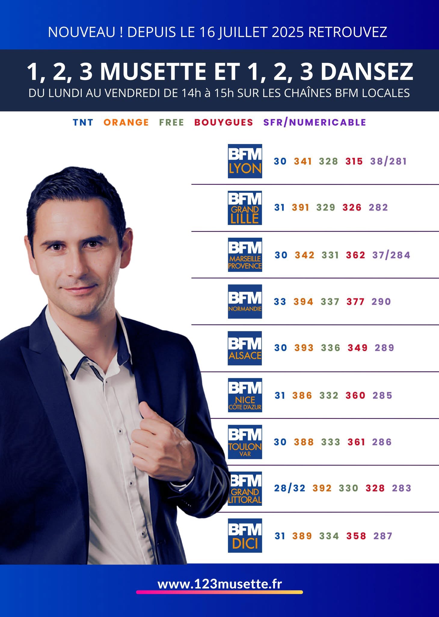 Jérôme Richard: programmateur et chroniqueur des émissions. 1,2,3 Musette et 1, 2, 3 Dansez sont les seules émissions TV hebdomadaire d’accordéon diffusées dans toute la France et la Belgique, sur le satellite, le câble et l’ADSL ainsi que sur la TNT dans plusieurs régions. Chaque semaine, l’animateur Pierre-Yves Lombard et son chroniqueur programmateur Jérôme Richard (L’accordéoniste le plus titré: 6 fois champion du monde), reçoivent les meilleurs accordéonistes de France.